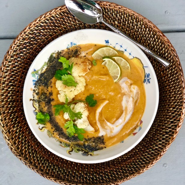 In a 5 qt stock pot or enamel bottom pot, heat ghee or butter on medium heat. Add onions, ginger, garlic and red pepper to pot and stir frequently until vegetables are fragrant and wilting and releasing their juices (about 5 minutes). Season with salt and pepper. Add lentils, curry and smoked paprika to pot followed by vegetable stock. Bring the vegetables and stock to a boil, cover pot and reduce heat to simmer. Simmer for about 25 minutes until vegetables are quite tender. Transfer soup to blender or food processor and purée until very smooth. Transfer back to pot and stir in coconut milk (make sure can contents are well mixed). Adjust seasonings to taste and add lime juice just before serving. Ladle soup in bowls. Top with some roasted cauliflower, gomasio and cilantro and an extra dollop of coconut milk if using. Serve immediately and enjoy!