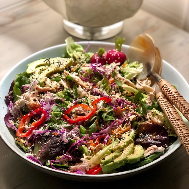 Love how easily this salad comes together for a quick and delicious meal with great flavor. I used some torn mint leaves and parsley leaves to brighten up the veggies and it was delicious with the chicken, salad and dressing. I add lots of sesame seeds (both white and black) for extra flavor and visual appeal. The sesame oil and rice vinegar in the dressing add an asian flair to the salad. For the chicken, I like to use roasted chicken breast, but you could substitute rotisserie chicken or leftover chicken from the night before if that makes your preparation easier. Shredding the chicken, shaving the cabbage, and thinly slicing the other vegetables allows you to perfectly blend all the ingredients. I have a hand slicer that also has a julienne blade. I have learned that although the slicing and cutting is often time consuming, it makes a huge difference in the final product. It is very worth it to invest in a quality set of knives (and keep them sharpened) and quality kitchen tools.