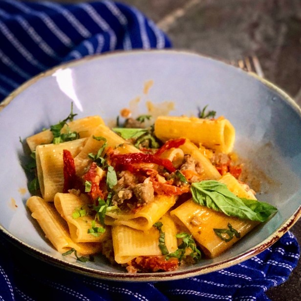 While traditional red sauce is great, this pasta relies on the slightly more intense flavor of sun dried tomatoes for its flavor base. It also has some wine, stock and cream to round it out. At my local market, Central Market, I can buy some very tender sun dried tomatoes that are a perfect texture and not marinated in oil. I prefer these tomatoes to the jarred variety. For the sausage, I like to use a sweet Italian sausage and add some fennel seeds to highlight the flavors. Fresh basil at the end adds a nice pop of color and bright flavor to finish the dish.