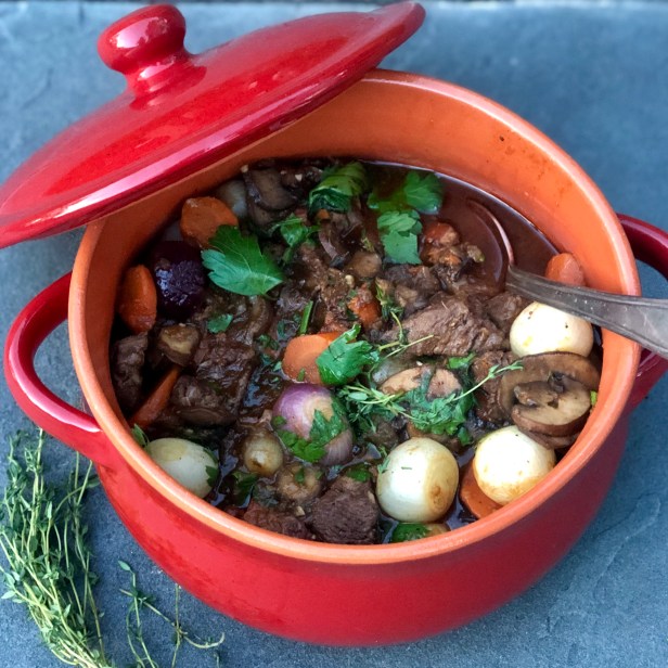 A slow cooking French classic that has layers of great flavor and is the perfect option for a cold night.  I adapted my recipe from the Barefoot Contessa, making a few changes to the original recipe.  I opted to use tenderloin beef tips rather than the traditional chuck roast. I find the beef is so much more tender and less stringy when cooked.  I also used a mixture of fresh pearl onions rather than the frozen and sautéed them with the mushrooms before adding them into the stew. Using a nice bottle of dry Pinot Noir, along with a good cognac help to build great flavor in this stew.  Serve this hearty  dish over mashed potatoes and a side of peas for an ideal winter comfort meal.