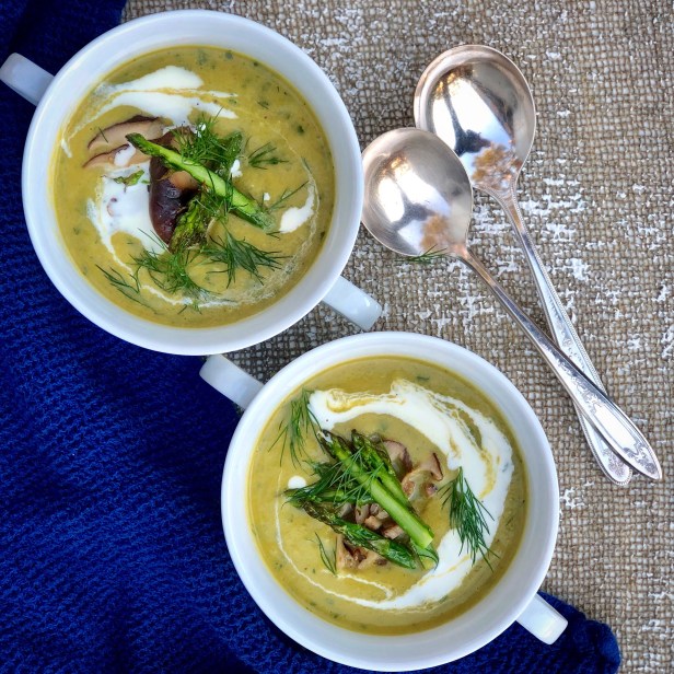 I found some beautiful fresh asparagus at the market this week with fresh firm tips and thick, meaty stalks. They were perfect for this soup that I paired with lots of fresh herbs, chives, parsley and dill for a delicious soup, ideal for the first day of Spring. I like to roast the asparagus first as I think it renders a better flavor, and then add it to the sautéed onions and garlic. To finish the soup, I use lots of fresh herbs which not only adds great flavor, but also helps enchance the soup’s bright green color. I garnished with asparagus tips, sautéed mushrooms, fresh herbs and a splash of cream to finish the soup. A nice introduction to Spring!