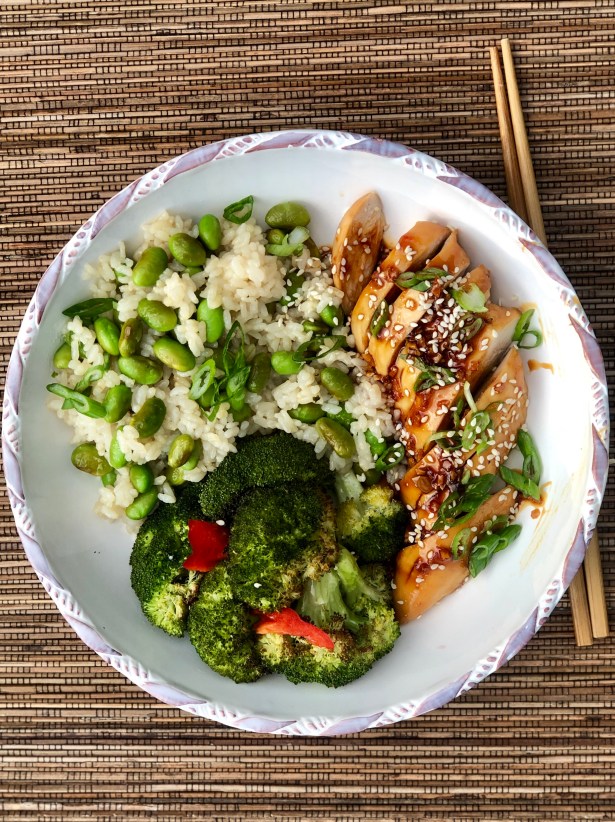 The key to creating great flavor in this dish is marinating the chicken for several hours before baking and then reserving half the marinade for glazing the chicken at the end of the cooking process to add delicious asian flavor. Any extra chicken would be great in a salad the next day. The chili garlic paste adds some heat to the dish, but not an essential ingredient if you prefer a less spicy version of the chicken. It pairs beautifully with sushi rice and edamame and some roasted broccoli for a dinner that is sure to please both kids and adults.