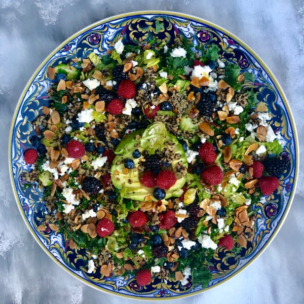 This salad has great flavor, texture and color.  I love to use both roasted and raw greens in the salad that add a bit of complexity and texture. The cellulose in kale can be a bit overwhelming for some salad eaters, but I have found that gently rubbing the leaves between your hands helps to break down the cellulose and makes the leaves much more palatable and enjoyable.  Roasting shaved Brussel Sprouts caramelizes them just enough to help bring out their natural, sweet flavor and tenderizing them. The berries add some sweetness and seasonal beauty and work so well with the toasted almonds and quinoa.  For vegan diners, simply eliminate the feta. I like to top this salad with a lemon-balsamic vinaigrette, but you can opt for any light dressing.  If you need a more substantial salad for dinner, you could very easily add chicken on the side.