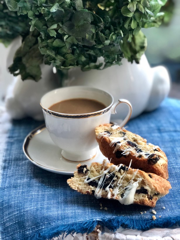 A wonderful dessert, but a decadent little meat with your morning coffee as well. I love the almond flavor in these biscotti. I do a similar version with cherries. Either way, this soft Italian cookie is a delicious treat! You can skip the drizzle of white chocolate at the end, but it looks beautiful and adds a little extra indulgence to this delicate cookie.