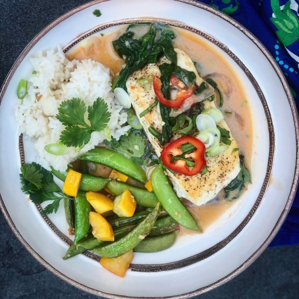 This is a delicious and quick sauce that is so delicious with the fish. I adapted the sauce from a recipe in the New York Times. I love the fresh basil and cilantro and the spinach which all work so well with the fish. If you don’t have halibut, you could certainly use any other fish that is fresh and accessible. It is great served with sticky rice and starry vegetables. I used snap peas and yellow squash.