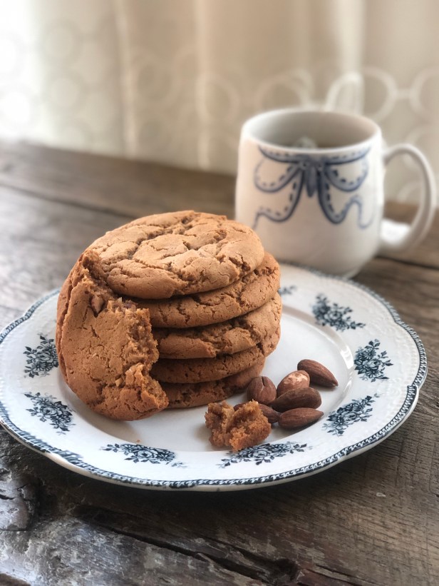 I love almonds and these cookies are a perfect tribute to my favorite nut.  They are a lovely chewy cookie with great almond flavor and a crispy exterior. The cookie gets it’s delicious flavor from almond butter, almond extract and chopped almonds. I think they are just delicious and so perfect with your favorite tea.