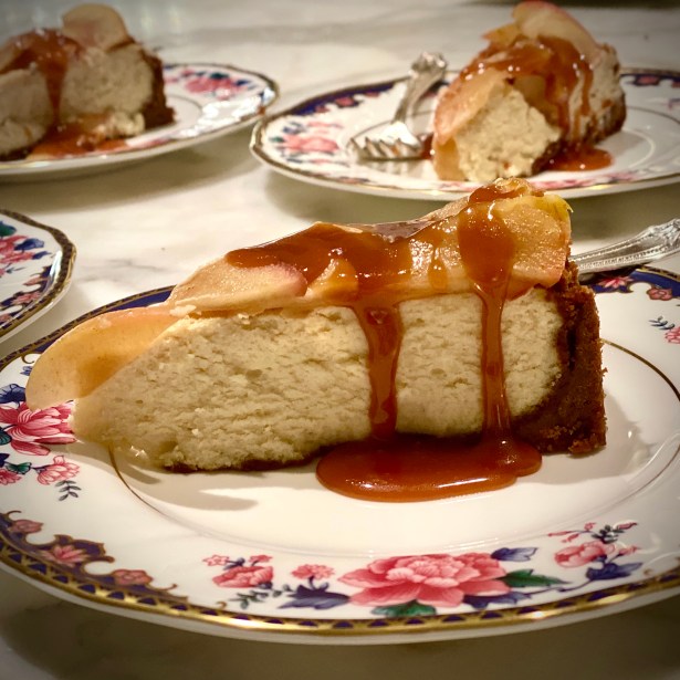 Cheesecake is such a versatile dessert that you can customize very easily to any season. I used thinly sliced apples for this recipe and a homemade caramel sauce, although you could easily buy a quality ready made one if you would like. I use a firm tart apple like Envy, and I love to keep the peel on for a hint of color. I have found that making sure all the ingredients for the cheesecake are at room temperature helps guarantee that the cheesecake cooks evenly and resists the tendency of cracking during the baking process. The cheesecake can be made a day ahead and in fact, it is actually better that way. I love the cinnamon flavor and crispy texture of the biscoff cookies that are perfect with the apples. If you cannot find the biscoff cookies, you could opt for the traditional graham cracker crust, or even gingersnaps.