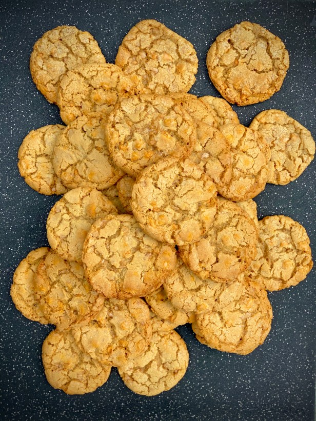 Preheat oven to 325 degrees convection or 350 regular. In a small bowl combine flour, salt, baking powder and baking soda.  In a mixer fitted with the paddle attachment, blend butter and sugars until light and creamy. Add egg and vanilla and combine to blend.  Scrape down sides and add flour mixture, resist over mixing. Add  butterscotch morsels and bits o’ brickle until incorporated.  Take a heaping tablespoon of dough and roll in the palm of your hand into a tiny ball.  Place cookies on parchment-lined baking sheet about 1 1⁄2 inches apart.  Bake for about 10-12 minutes.  The cookies will look crackled on the top and slightly raw in between.  Remove from oven and allow on baking sheet for 5 minutes and transfer to rack to cool completely.  Enjoy!