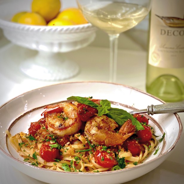 The fresh tomatoes and sherry add such great flavor to this dish and taste so great with the shrimp.  If you want to avoid the meat, you could forgo the bacon in the recipe, but I love the smoky flavor that it adds along with the crispy panko.   The sauce comes together relatively quickly so get your water boiling for the linguine while you are making the sauce and searing the shrimp.  Pour yourself a chilled glass of Sauvignon Blanc and enjoy!