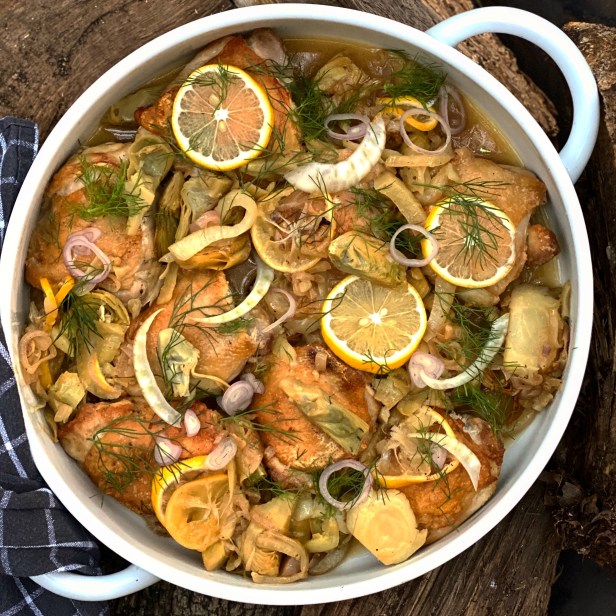Preheat oven to 400. Pat chicken thighs dry with paper towel to absorb any excess moisture from thighs. Salt the chicken generously with salt and pepper. Heat a large, heavy bottom skillet that is oven-proof (leaving space between pieces or cook in batches if pan is not large enough) on medium high with 2 tablespoons of olive oil. Place chicken thighs, skin-side down into the pan and sauté each side for about 4 minutes until skin and underside develop a golden color. Remove from the skillet and set aside keeping warm. Reduce heat a bit, add butter, shallots and fennel, season with additional salt and pepper, stirring frequently until soft and fragrant (about 5 minutes). Stir in artichokes and sliced lemon and turn up heat, pouring in wine. Stir and deglaze your pan scraping up all brown bits. Place chicken thighs back in your pan, skin-side up and transfer to the oven. Bake for an additional 25 minutes or so or until chicken is cooked through. Remove chicken from oven and garnish with fennel fronds and some fresh sliced lemon as desired. Serve with rice or mashed potatoes. Enjoy!