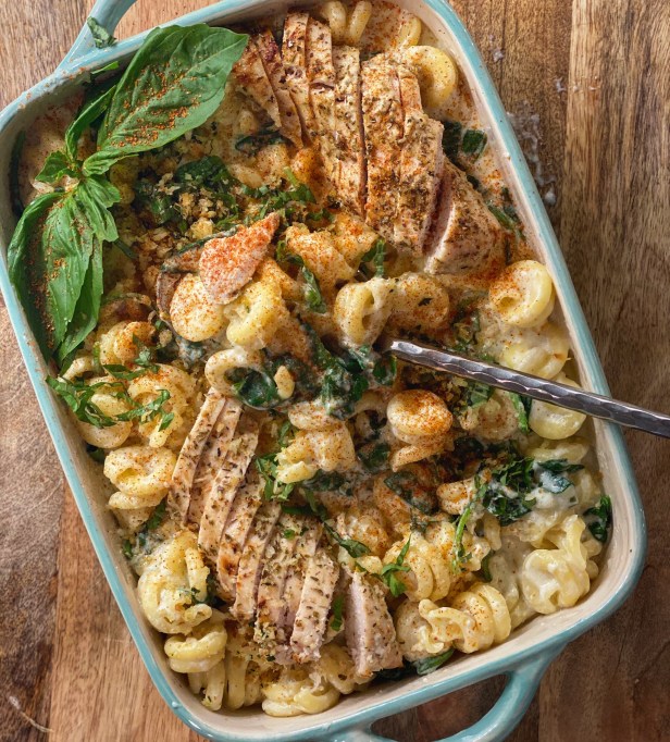 This dish defines comfort food and I love adding a little cheese to the béchamel to give it a little more body and flavor. I used a blend of cheeses “Quattro Formaggio” which you can find in the cheese section of your market. It melts beautifully in the sauce, but you could also use another cheese if you prefer. The baby spinach wilts quickly and tastes great with the basil. I would select a curly pasta that the sauce can hug onto effectively and cook it al dente. It seems like a lot of sauce, but it works best if pasta has lots of sauce. You can also add the cooking juices from the chicken to the pasta for extra flavor when you drain the pasta before adding the béchamel. I have included a link to my buttermilk marinated chicken and seasoned it with greek seasoning and oregano for this recipe. You can add olive oil when you are baking it. If you prefer a vegetarian dish, just eliminate the chicken.