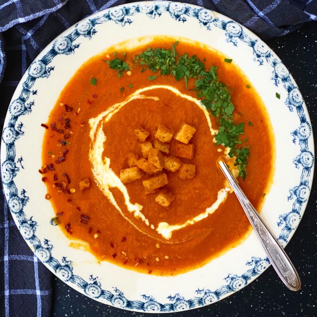 Preheat oven to 400. Line 2 rimmed baking sheets with parchment paper. Place the tomatoes on one sheet and the cauliflower and butternut squash on the other baking sheet. Season both with salt and pepper and toss each set of vegetables with a bit of olive oil to coat (be generous). Roast in the oven for about 20 minutes until tomatoes are bursting and vegetables are caramelizing and tender. While vegetables are roasting, heat a heavy bottom pot (my le creuset enamel pot is perfect for this), with a couple of tablespoons of olive oil. Heat to medium heat and add onion, carrot, celery root and garlic. Season with salt, pepper and chopped thyme stirring frequently until fragrant and tender (5-10 minutes). Once vegetables are roasted, add them to the onion mixture along with roasted red peppers with any accumulated cooking juices. Add about 3 or 4 cups of stock so vegetables are nearly covered, turmeric and smoked paprika. Bring mixture to a boil, reduce to a simmer and cover for about 30 minutes until all the vegetables are fork tender, adding more liquid if needed. Remove soup from heat and transfer to a blender or food processor, and process in batches if necessary or use an emulsion blender to purée soup until smooth. If soup appears thick, add additional stock, a 1/4 cup at a time to achieve desired thickness. Adjust seasonings to taste. To serve, ladle soup in bowls, add a handful of croutons in the center. Sprinkle with crushed red pepper and a some fresh cilantro. If you are not vegan, drizzle a tablespoon of cream on top to finish. Serve immediately and enjoy!
