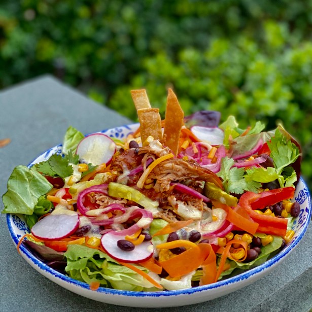 This is an easy way to prepare a make-ahead meal for a family that is tasty and easy. I simply placed all the ingredients for the chicken in the slow cooker and let it simmer all day. The chicken tasted great with a hearty salad. I chose a creamy mustard for a dressing but you could opt for simple oil and vinegar if you prefer. The pickled red onions were a perfect garnish with the chicken. They can be made relatively quickly and easily stored as an addition to a sandwich or another salad. You can always serve the chicken on a brioche bun if you need a heartier meal. If you don’t have time to make your own bbq sauce, you could always select your favorite store-bought brand and use that, but making your own is not so complicated and allows you to add additional spices as desired.