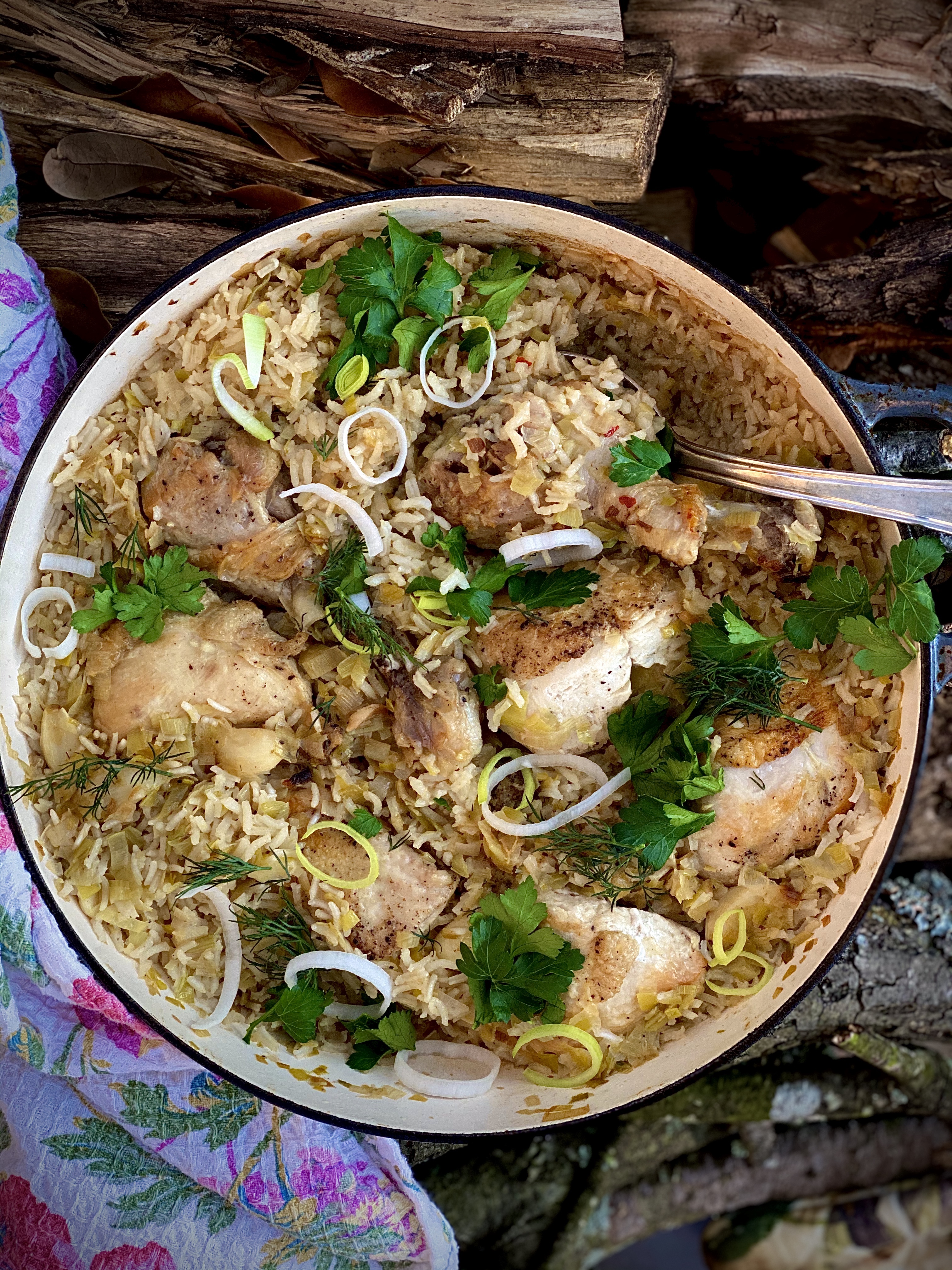 Heat a large heavy bottom ( I use an enamel one) skillet with a lid and heat the olive oil on medium high heat. Pat chicken pieces dry all over with paper towel and season generously with salt and pepper. Place chicken skin down in pan and sear for about 4 minutes per side until golden brown all over. Remove chicken from pan, lower the head to medium low and set aside on a plate. Add the butter to the pan along with the leaks and garlic and stir frequently until leeks are quite tender (5-7 minutes). Add rice to pan, raise heat to high and stir frequently for an additional minute or 2 to coat rice and brown rice a bit. Next add white wine and Greek seasoning to pan and continue to stir, scraping up any brown bits. Add stock to the pan, stirring once or twice and place chicken back in pan bringing mixture to a boil. Lower the heat to low, cover your pan and allow chicken and rice to simmer covered for about 25-30 minutes until all liquid is absorbed and chicken is cooked through. Remove from heat and let dish sit an additional 10 minutes. (Cooking time may need adjusting according to the size of chicken pieces, but you can always add additional stock if you need more cooking time). Before serving, garnish dish with fresh herbs and enjoy with vegetables and salad!