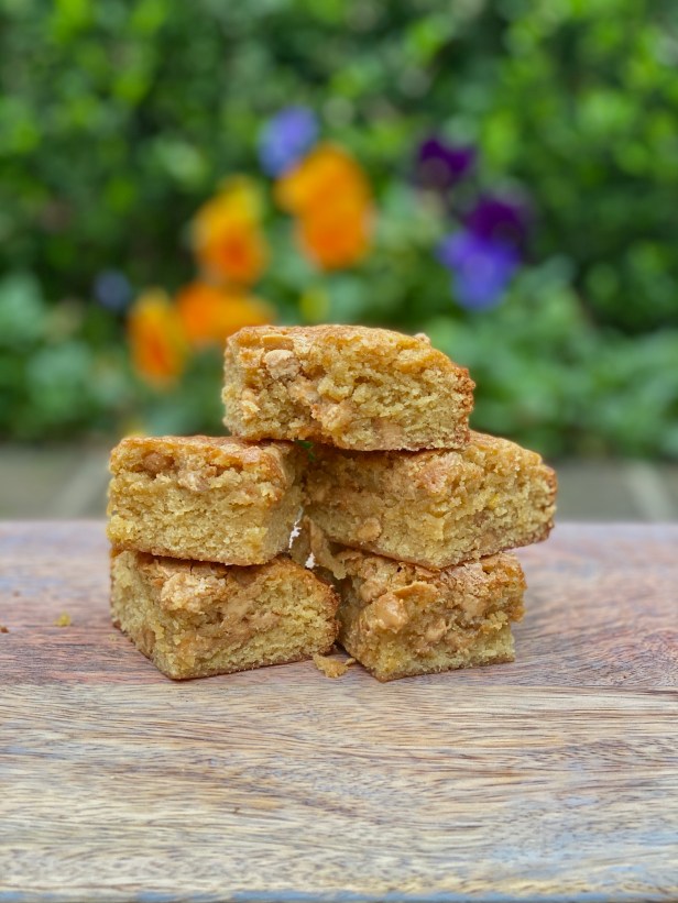 These Blondies are a great base for a variety of flavors. You could add white chocolate, butterscotch and nuts to the recipe and adjust the recipe to suit your taste. It also has the benefit of being mixed by hand, no special kitchen equipment required. I love the reeses chips, they have a good peanut butter flavor but not overwhelming. Happy baking!