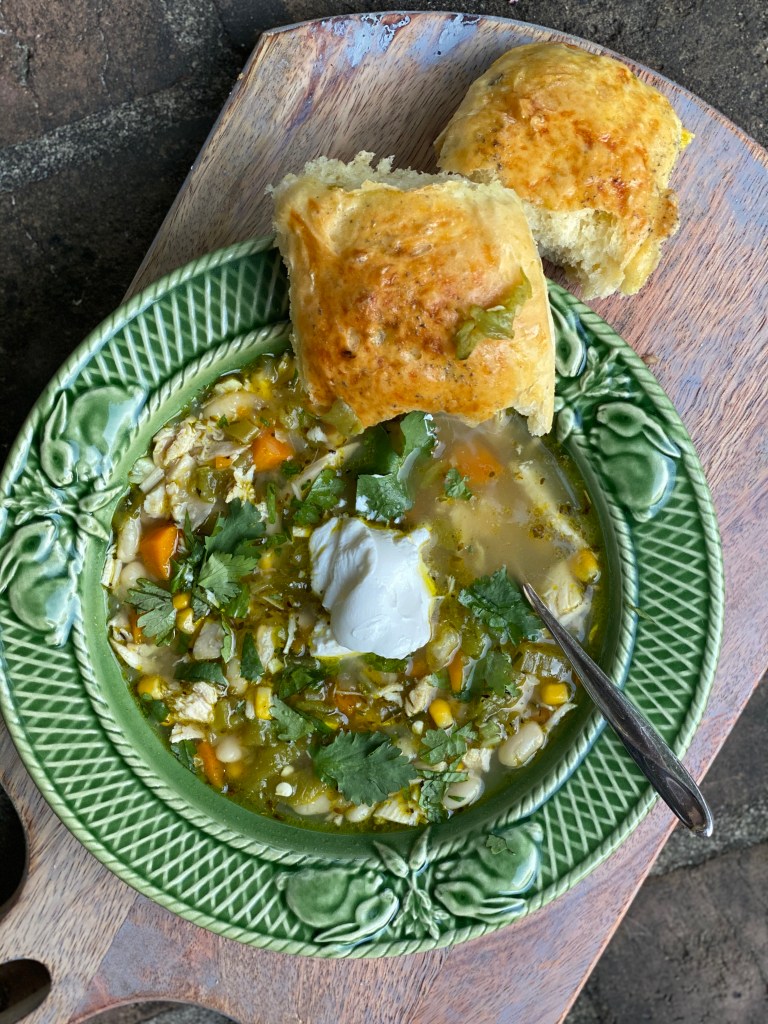 Clean your pot and add 2 tablespoons of olive oil. Add onion, garlic, carrots, celery and poblano pepper. Sauté on medium heat for several minutes until aromatics are fragrant and tender. Season with salt pepper and cumin. If you are using soaked beans, add them now, then add about 8 cups of your reserved stock. Bring soup to a boil, add oregano, reduce heat and simmer covered for about an hour until pre-soaked beans are tender (about 1 hour). Once ready, add corn (if you are using canned beans, add them with the corn), shredded chicken, lime, hatch chilis and cilantro. Adjust seasonings to taste, Ladle soup into bowls and serve with a dollop of sour cream as desired. Enjoy!