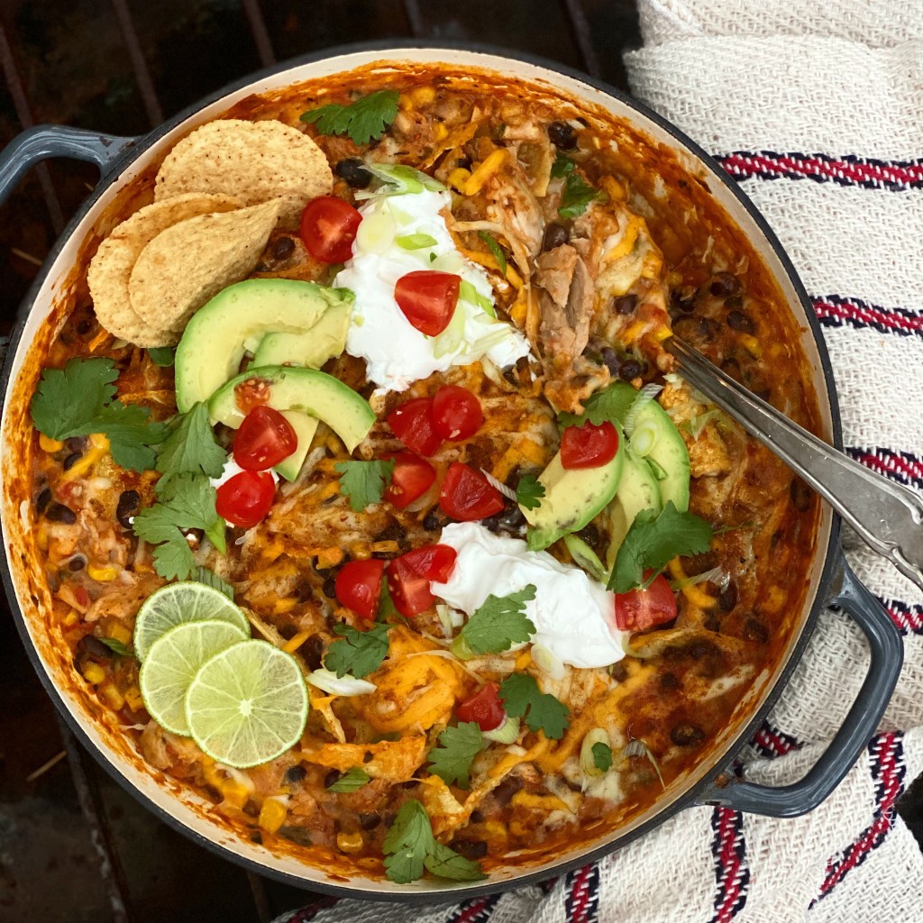 Preheat oven to 400°F. Heat oil in a 10″ oven proof skillet over medium heat. Add onion, poblano, garlic, cumin, coriander, taco seasoning and salt and pepper cook, stirring, until softened, and fragrant about 5 minutes. Lower heat to medium low, add black beans and corn along with salsa, lime juice and stock and heat for a few minutes. Next add salsa and sour cream. Stir in tortillas and chicken until covered and sprinkled shredded cheese on top of mixture. Transfer to oven and bake until cheese is melting (about 5 minutes). Top with any and all garnishes and serve with extra chips. Enjoy!