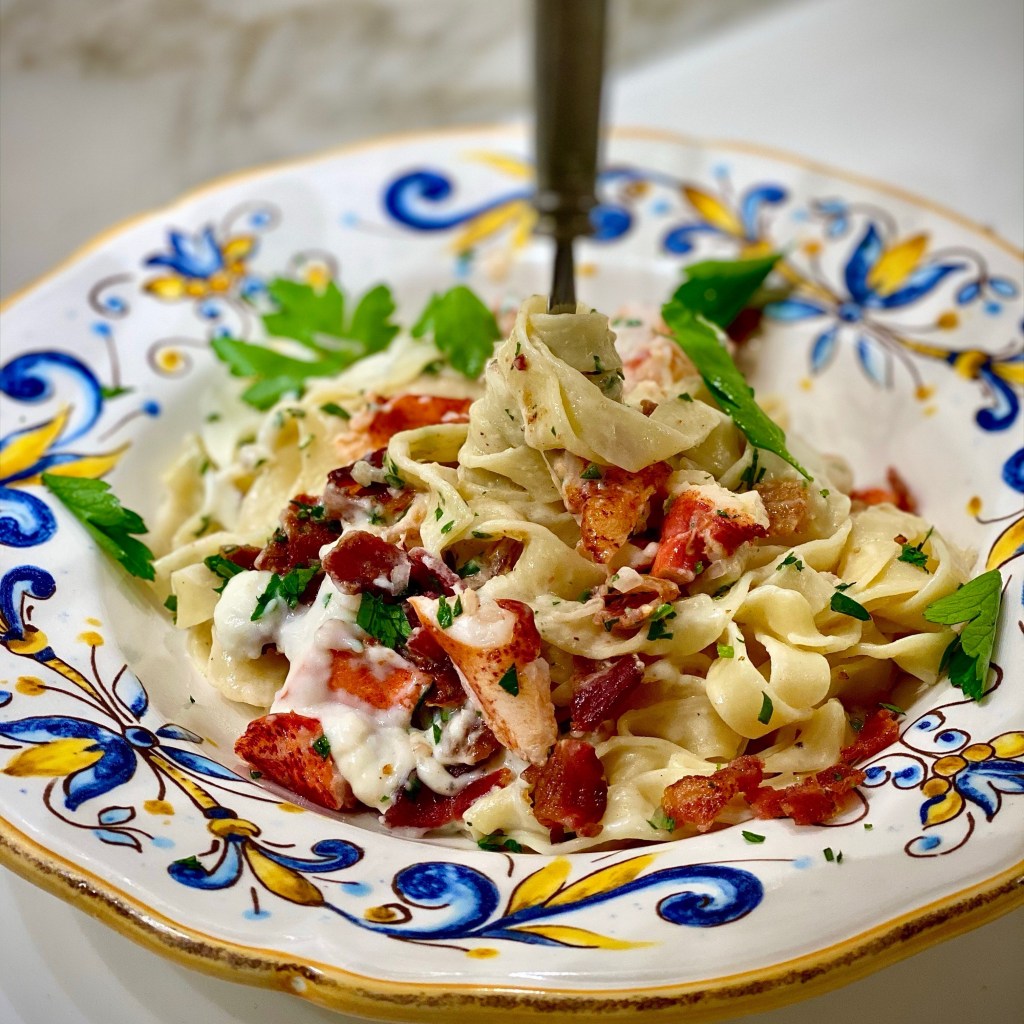 This dish is a Cross between a carbonara and al fredo. I ordered the steamed lobster directly from Maine, thanks to some great friends who introduced us to Luke’s Lobster from Cape Elizabeth, Maine. They ship flash frozen steamed lobster directly to your door. It comes frozen, so all you need to do is thaw and heat for a delicious meal. I added a few simple ingredients to produce a wonderful, tasty meal.