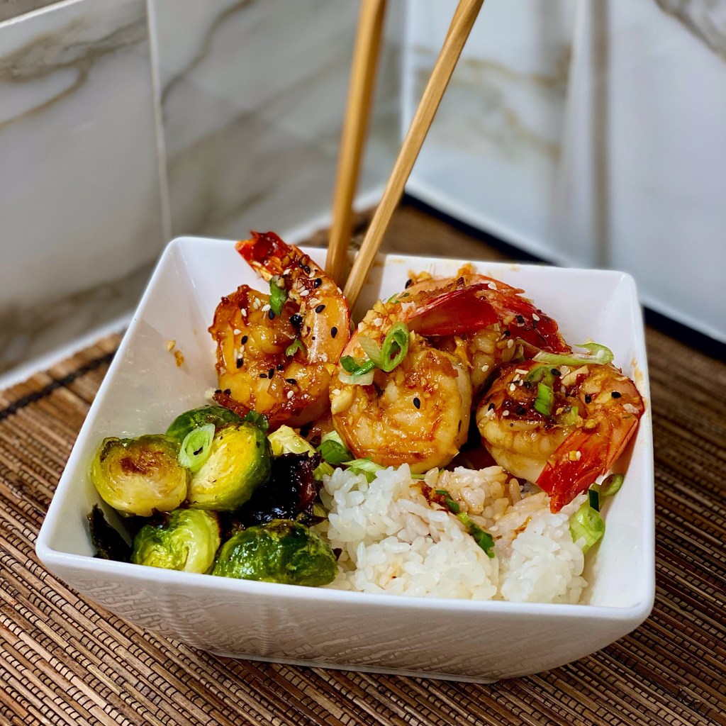 - In a small bowl whisk honey, soy sauce, vinegar, chili garlic sauce and ginger and garlic. Season shrimp with a bit of salt and pepper, then place shrimp in a bowl and marinate for about 15 minutes with about 1/4 of sauce. In a large sized skillet (cast iron is ideal), add the butter and oil and heat to medium high. Add the shrimp and save marinade. Cook until the shrimp turns pink about 2 -3 minutes per side. After the second side is nearly cooked, add the reserved marinade and pour over shrimp. Continue cooking until the sauce starts to thicken and coats the shrimp (about 1 minute). Garnish with scallions and sprinkle with sesame seeds as desired. Enjoy with rice and roasted vegetables spooning excess sauce over rice or noodles.