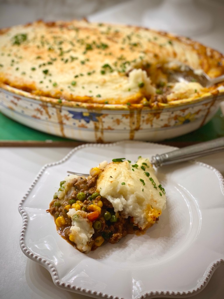 I have made this version of Shepherd’s Pie extra meaty with both ground beef and small pieces of tenderloin tips. The fresh herbs add wonderful flavor. I added some vegetables that come together in a lovely gravy. A Parmesan mashed potato is the ideal topping. Comfort food defined!
