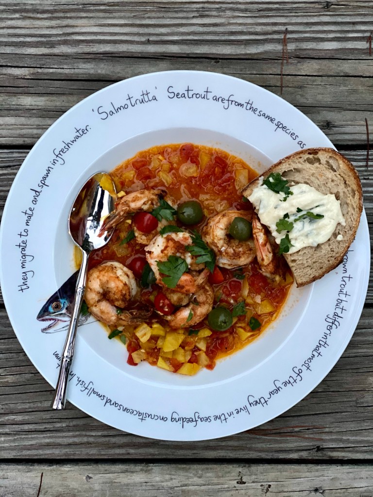 This is a relatively simple recipe, that is a delicious way to prepare seafood. I created the recipe in Florida where I have access to amazing fresh gulf shrimp. The key to this flavorful broth is the homemade stock. I usually make extra stock and freeze it for future use in a fish chowder or lobster dish. It holds very well for several months. It is the base of flavor that provides the building block for any seafood dish. Serve this with a delicious slice of high quality bread that can handle a big smear of the aioli. The dish is very light and the aioli adds just a hint of citrus and cream to balance it all out. I like to sear the shrimp before adding it to the stew, but if you can always add the shrimp at the last minute and steam it in the stew.