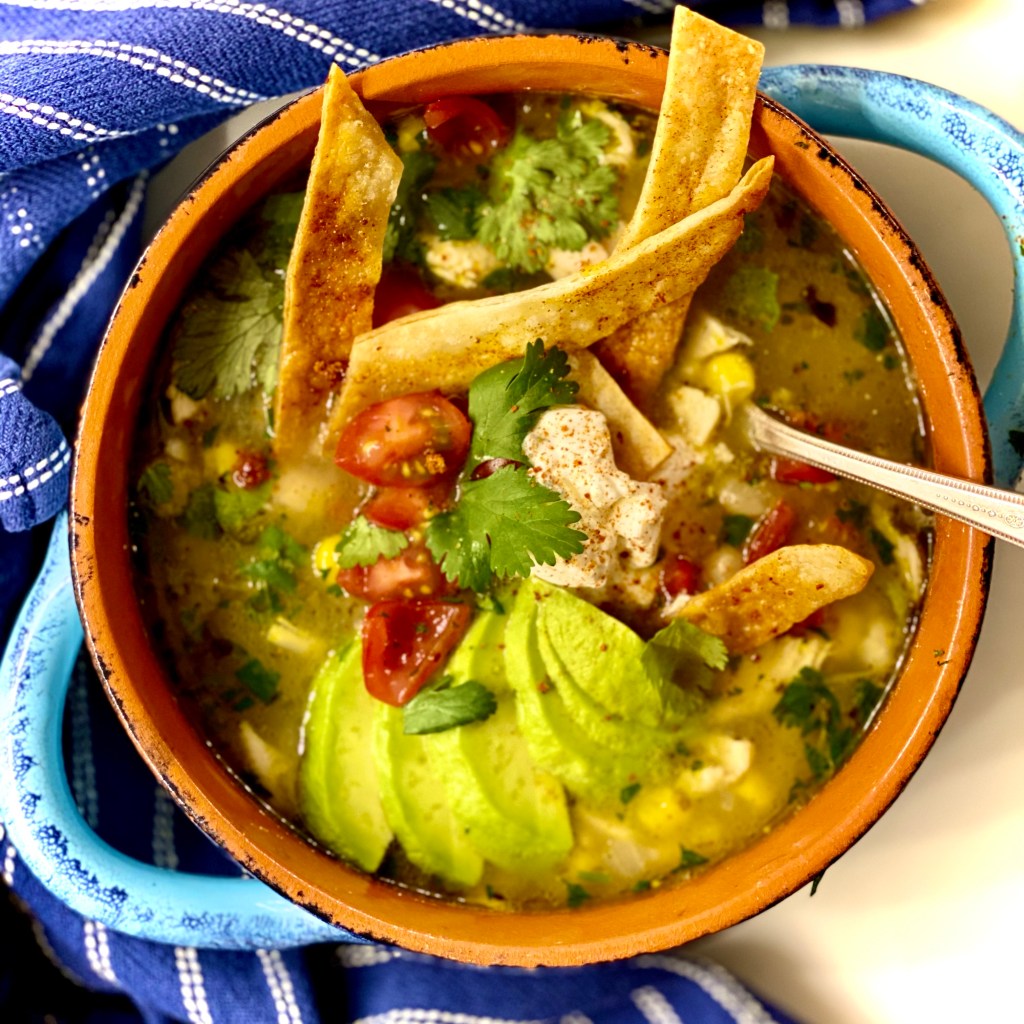 I use roasted tomatillos and a poblano pepper to build upon a chicken flavor base. As usual, I like to make homemade stock which has much better flavor and is much healthier than the store bought version. The recipe will give you extra stock which freezes beautifully and you can reserve for cooking rice or soups. The soup has beans and chicken which makes it a hearty meal.