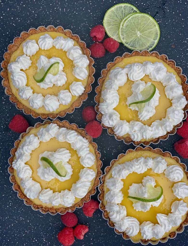 While the crusts bake, combine the egg yolks, sweetened condensed milk, key lime juice and zest in a separate mixing bowl. Whisk until light and fluffy and well incorporated. Divide filling into cooled tart crusts and bake for 6-8 minutes until filling is just set. Transfer the baked pies to a wire rack and allow to cool completely, then refrigerate until ready to serve. If decorating with whipped cream, whip all ingredients for whipped cream in a mixer with whisk attachment until cream is thick. Decorate or dollop cream on pies and refrigerate until ready to serve. Garnish with lime and berries. Enjoy!