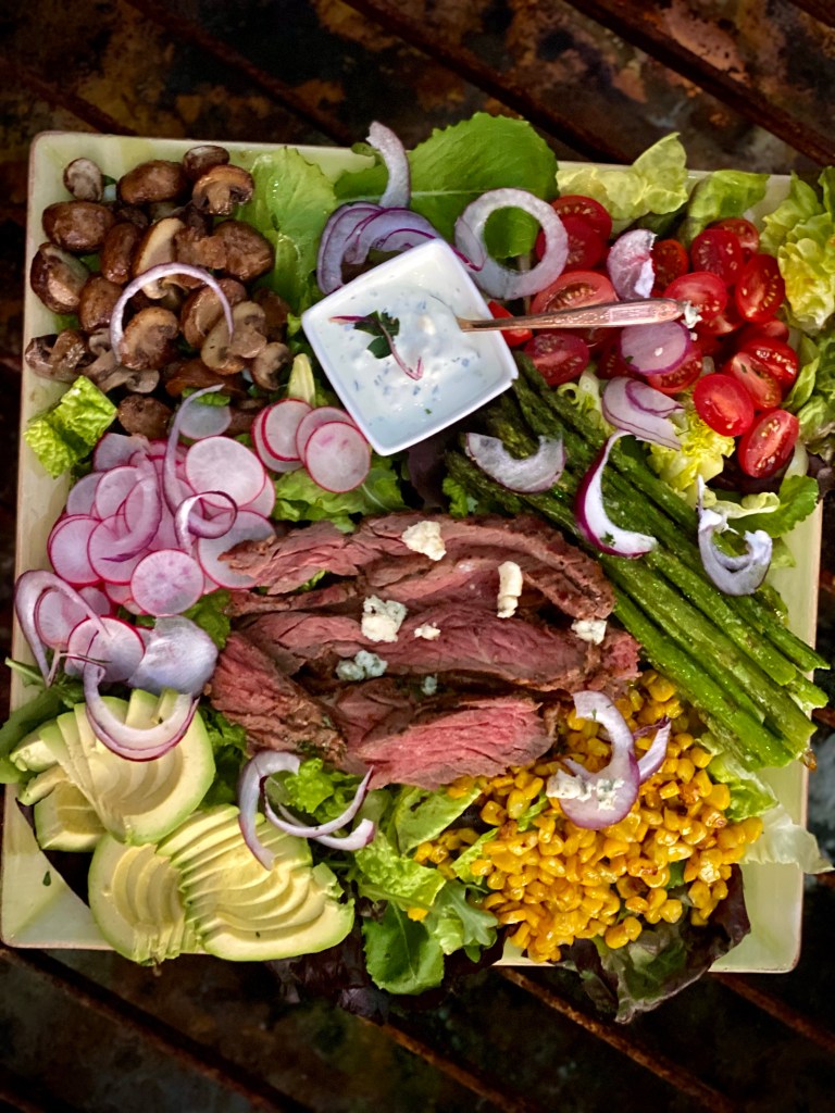 In a small skillet, heat a tablespoon of oil to medium heat. Sauté mushrooms for 5-7 minutes, season with salt and pepper and allow them to release their water. Set aside and in the same pan, heat a bit more oil and seasoning and sauté the corn until just turning golden. Place all the lettuce on a platter. Arrange all the vegetables around the exterior of the platter and place the sliced steak at the center. Take an ounce of Gorgonzola and crumble on the steak. Whisk together the remaining ingredients for the dressing. Drizzle all over salad or set to the side allowing people to serve themselves. Enjoy!