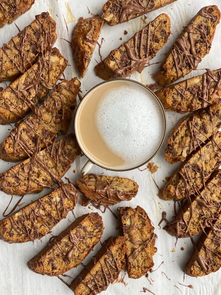 Preheat oven to 350. Line a baking sheet with parchment paper. Whisk together flour, coffee, cinnamon, baking soda and salt. In a bowl fitted with an electric mixer, cream the softened butter and brown sugar until light and fluffy. Scrape down the sides of the bowl and add the eggs, one at a time, until well incorporated. Beat in the kaluha. Add the flour mixture, followed by the chocolate chips and walnuts and stir on low speed until just combined. Scrape the sticky dough out of bowl and using lightly floured hands, divide the dough in half into two equal logs about 3/4-inch high and 2 inches wide allowing several inches in between. Brush the logs with the egg white on the top and sides. Bake for about 30-35 minutes. Allow the biscotti logs to cool on the pan for 5-10 minutes. Using a sharp knife, slice the logs on the diagonal into about 3/4-inch slices and turn the biscotti on their sides and place back in the oven for 5-7 minutes allowing them to bake and crisp up a bit. Cool the biscotti on the pan. When completely cool, melt the milk chocolate in the microwave on very low heat so it doesn’t seize. Using the tines of the fork, dip into the bowl and drizzle melted chocolate on the tops of the biscotti. Enjoy!