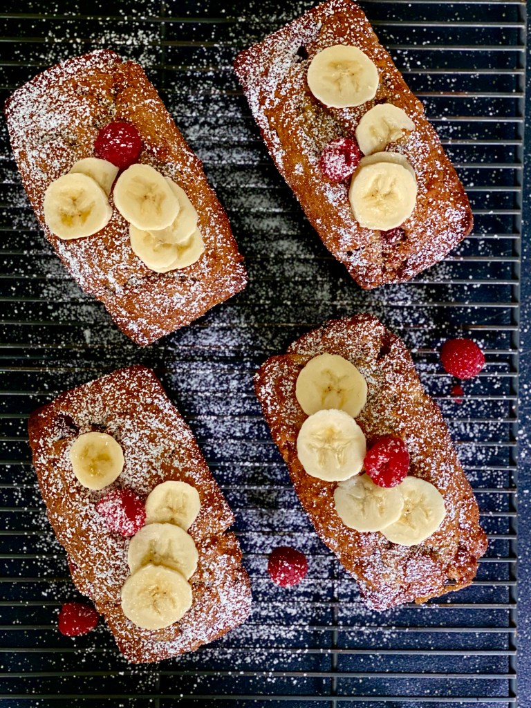 A wonderful use for overripe bananas and so delicious with the raspberries! Making the mini loaves is perfect for gifting and a great way to say I love you!