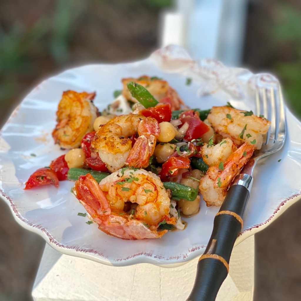 I came up with this recipe in a pinch because I was trying to make a hummus bowl and realized I had run out of tahini. I switched gears and made this chickpea salad instead which turned out to be a perfect companion to the shrimp. I love to use dried beans, soak them and boil them myself. They always taste better to me, but a little planning is in order if you go that route. Rock Shrimp is smaller and a bit sweeter than regular gulf shrimp and local to this area of florida. You could easily substitute regular shrimp, scallops or a lovely piece of fish for an easy weeknight meal. I served mine with a great green salad for a healthy dinner.