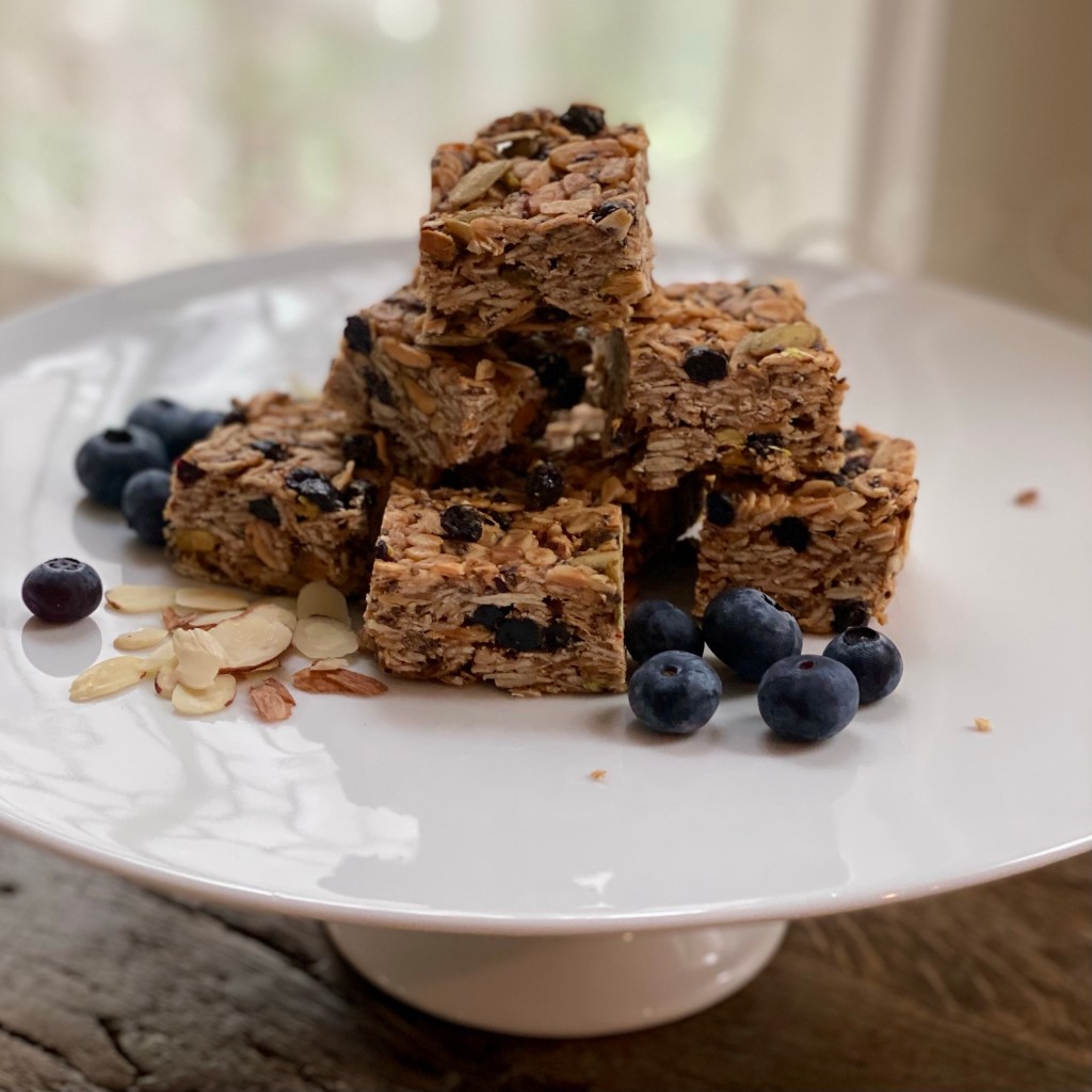 Love these healthy snacks that store well in the fridge and are the perfect energy boost after a workout or a snack. I love the flavor combination of almonds and blueberries together and so I used a little almond extract in the mix. You could substitute some maple syrup for the honey if you were strictly vegan. WYou can make lots of substitutions with this recipe including with the berries or using peanut butter rather than almond butter. The almond butter has a milder flavor. I also like to toast the nuts and oatmeal before I mix everything together. It’s not essential, but I prefer the flavor.