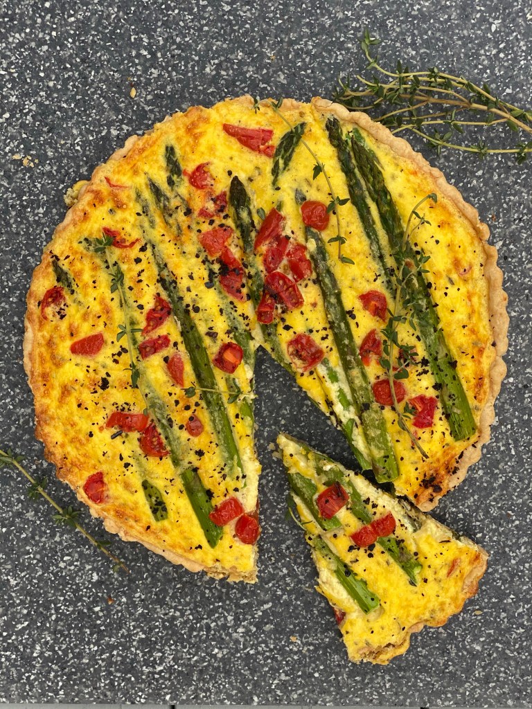 for filling: in a small saucepan, heat butter on medium heat and sauté onions and thyme with a bit of salt and pepper for about 7 minutes until tender and fragrant. Place onions in the bottom of cooled tart shell. Trim the bottoms of the asparagus spears. Whisk together the ricotta, eggs, Parmesan, seasoning, salt, and pepper in a large bowl until incorporated and smooth. Arrange half the asparagus spears in the tart shell, laying them all in one direction from top to bottom with half of the diced tomato. Use about three quarters of the ricotta mixture over the asparagus, covering the spears as evenly as possible. Arrange the remaining asparagus on top in the opposite direction to make sure that each end slice of quiche will have both tops and bottoms. Add the remaining ricotta mixture and tomato and spread it evenly. Bake until puffed and golden brown, about 20 to 30 minutes. Let cool at least 10 minutes before slicing. Can be served warm at room temperature. Enjoy!