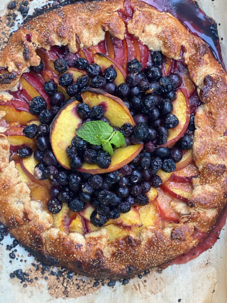 Preheat oven to 400°. Gently toss peaches, blueberries, cornstarch, , cinnamon, and ⅓ sugar in a large bowl. Roll out dough on a lightly floured sheet of parchment to a 12″ round. Leaving about a 1 1/2 inch border, arrange the peaches in concentric circles beginning with outer rings and working toward center in a fan design. Arrange blueberries on the top. Lift dough edges up and over the outer ring of peaches. Nestle diced butter into the tart in various spots. Whisk together egg and cream and brush the exposed dough with egg wash. Sprinkle with turbinado sugar if using. Transfer galette to a baking sheet on the parchment paper and chill for about 15 minutes. Bake galette for about 45 minutes until the crust is golden and juices begin to bubble. Serve warm or at room temperature with a sprig of mint as garnish and good quality vanilla ice cream and enjoy!