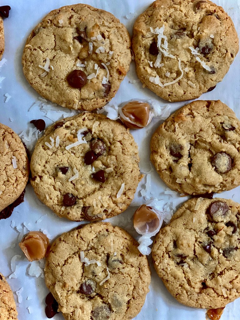 Preheat oven to 350. Line a baking sheet with parchment paper. In a medium bowl, combine flour, salt, baking powder and baking soda. Using a mixture with the paddle attachment, cream butter and sugars until smooth and creamy. Reduce speed of mixer and add egg and vanilla until well incorporated. Add flour mixture and mix on low. Fold in chocolate and coconut. Using a 2 inch ice cream scoop ( or about 2 tablespoons of dough,scoop dough in a ball. Take one caramel and place it in the center of the dough ball so it is completely wrapping the caramel (this will help the caramel stay contained in the dough during baking process). Place cookies on prepared baking sheet about 2 inches apart. Bake for 10-12 minutes in the middle of your oven until just cooked and tops are beginning to crackle. Remove from oven. Let cool 5 minutes, transfer cookies to cooling rack to cool completely. Enjoy!