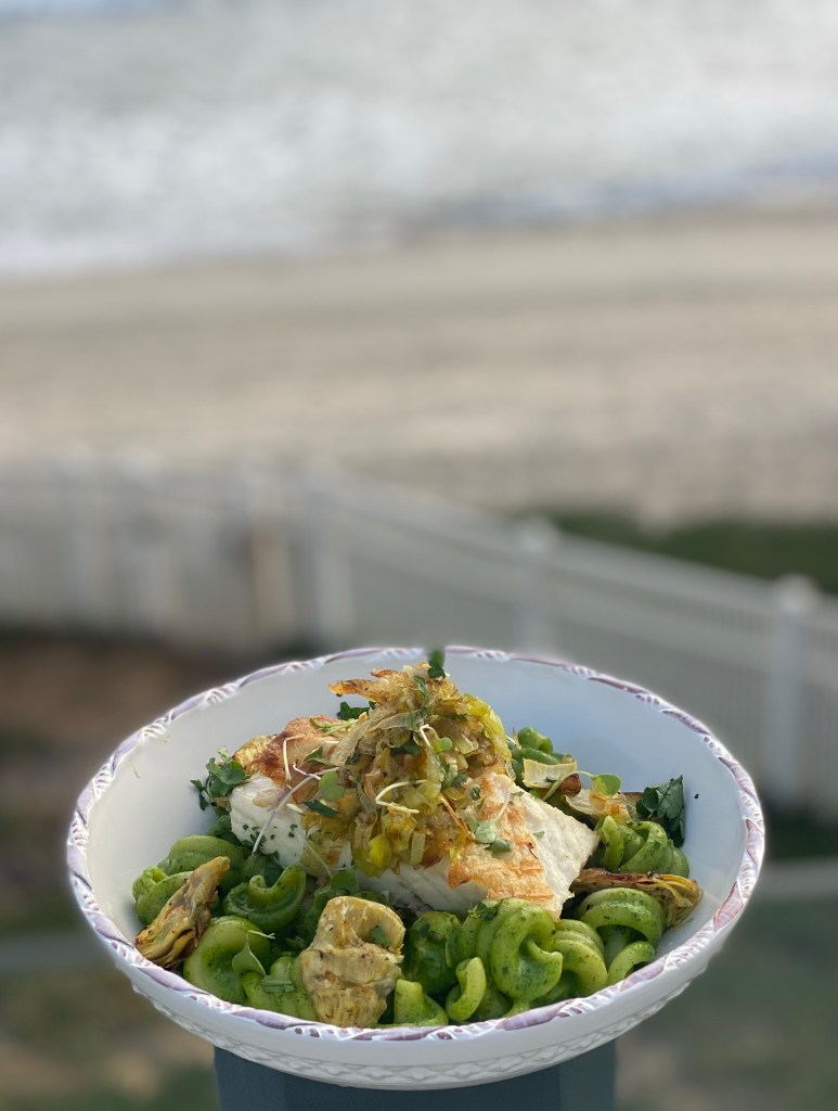 Toss the sauce in with warm pasta and stir allowing sauce to thoroughly coat pasta, then add roasted artichokes. Place halibut on pasta and top with leeks. Serve immediately with fresh green salad and bread. Enjoy!