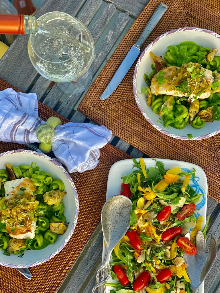 So excited to be on the west coast and discover all the beautiful fresh food this beautiful state of California has to offer! I created this meal to feature this locally caught fish. I found a wonderful markey Seaside Market in SoCal that has amazing fresh and locally caught seafood. If you don’t have halibut, another white fish would be wonderful,as well. A perfect dinner for 2, serve with a delicious salad and hearty bread.