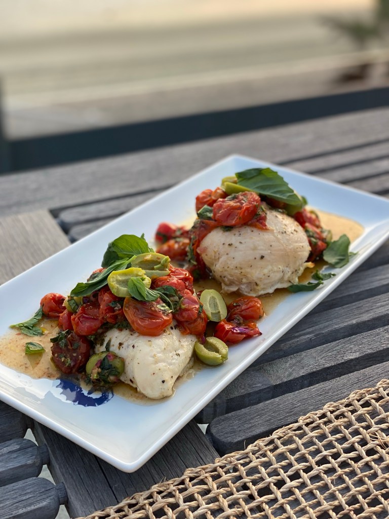 This topping is great for chicken or fish. It’s fresh, easy and delicious. Roasting the tomatoes brings out wonderful flavor. I like to marinate my chicken in buttermilk for a good 24 hours ahead of time along with seasoning. as it really helps tenderize the poultry. You can grill or bake the chicken I love using the castelvetrano olives for this recipe but you can opt for any olives. Serve this with rice or potatoes and a good hearty salad for a delicious meal.