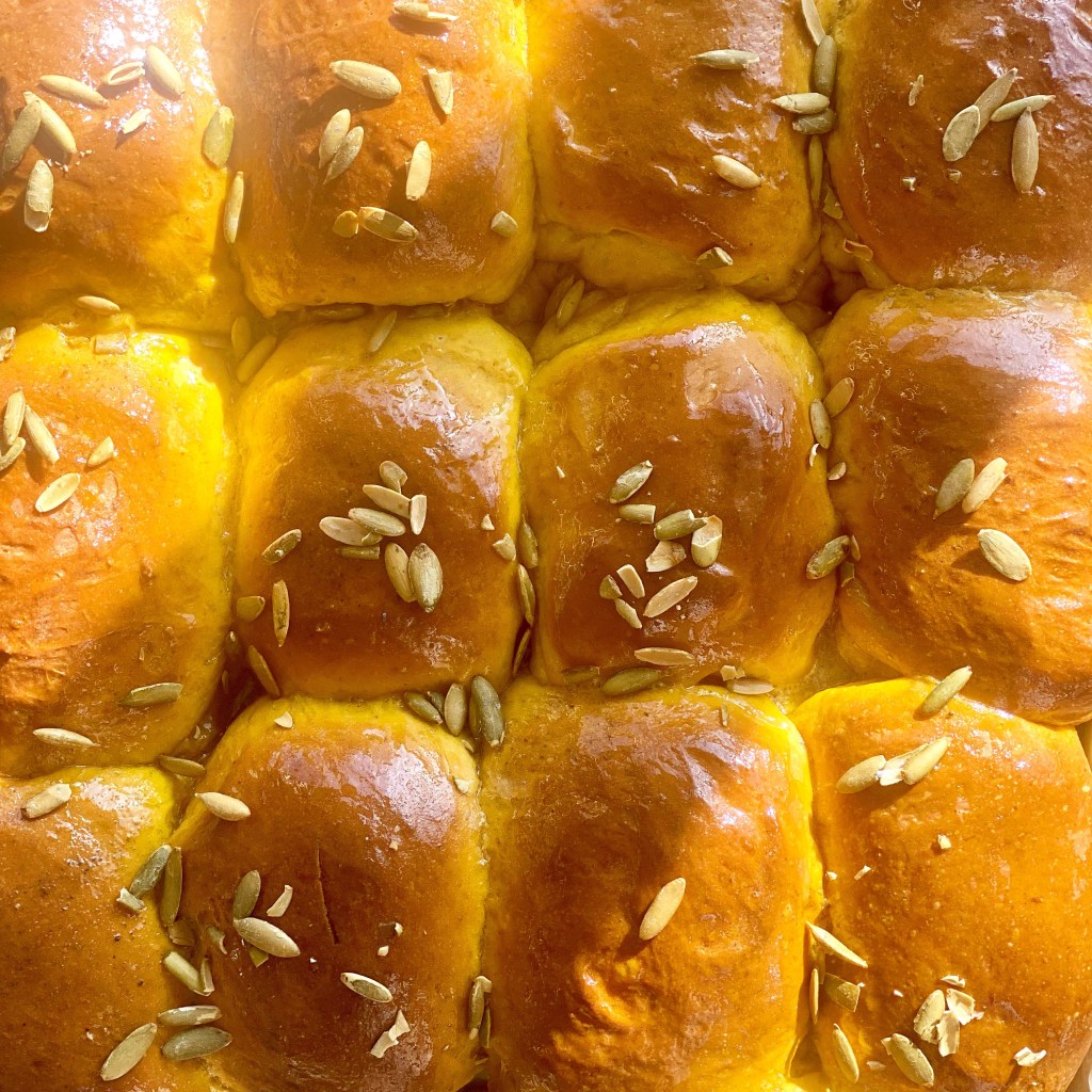 Love the smell of bread baking and these beautiful rolls with hints of pumpkin and warm spices are a perfect way to invite fall aroma in your kitchen. These are wonderful heated and served with a little butter and honey. Happy fall baking!