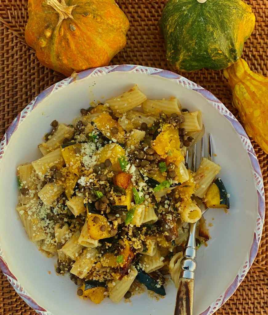 This vegetarian pasta dish is full of fall flavor with chunks of squash and earthy sage and the sweetness of the roasted shallots. I love the lentils in the dish and such a great way to add some protein. I sprinkled with parm and toasted panko for texture and flavor.