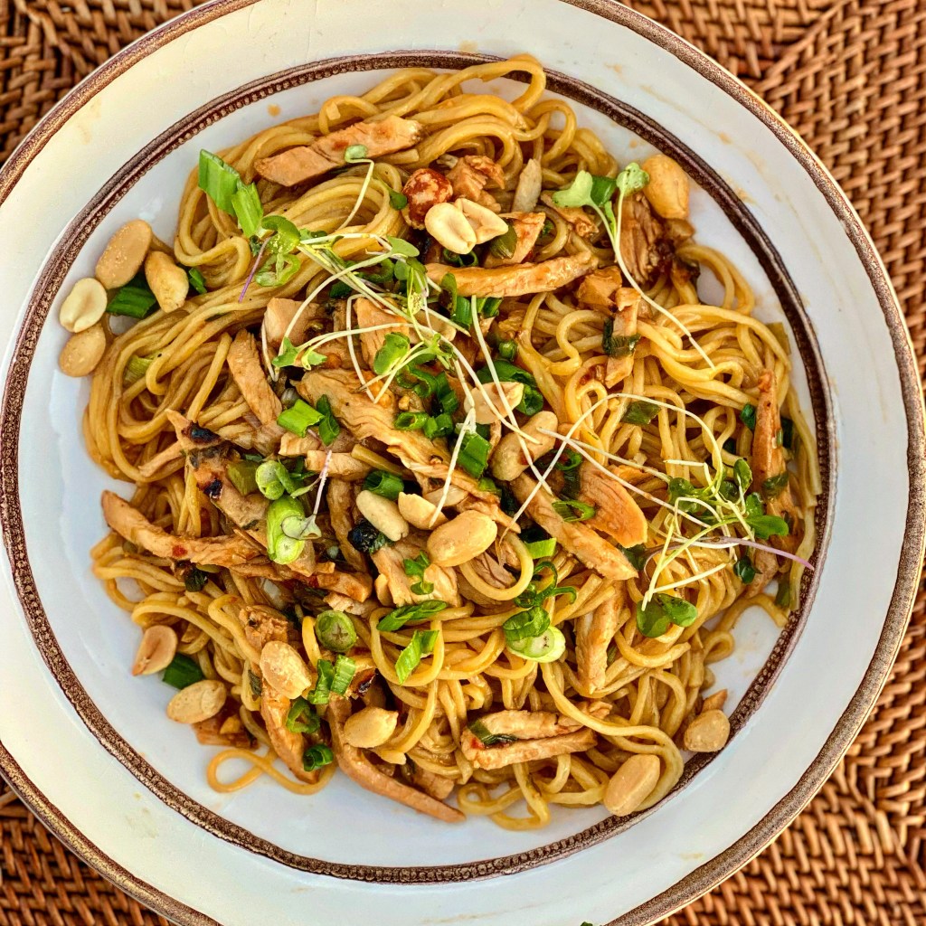 This is a great recipe to make use of leftover grilled chicken and a simple recipe with just a few ingredients. A great weeknight meal. If you can’t find Asian noodles, choose angel hair pasta. I found some fresh Asian noodles in the market no they were perfect with this dish. Make sure you slice the chicken in thin strips as it blends in easily with the noodles.