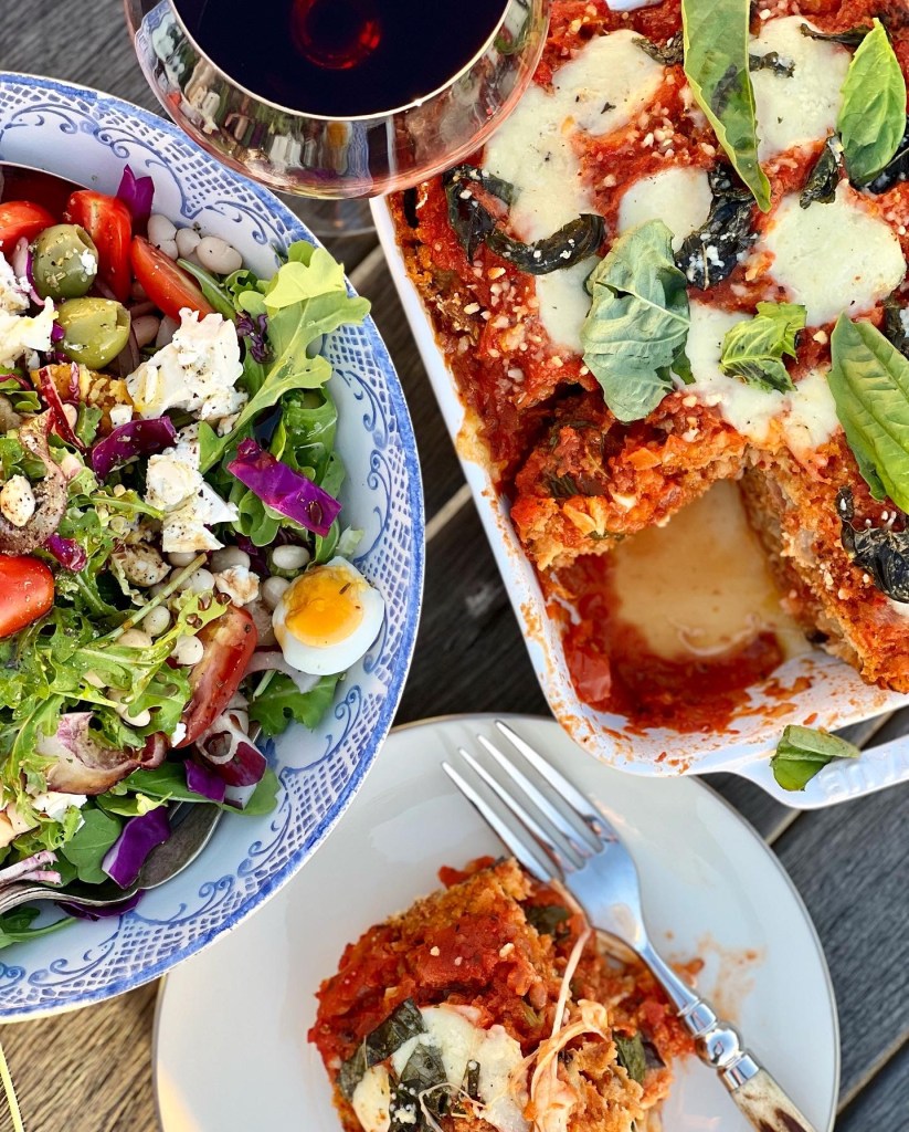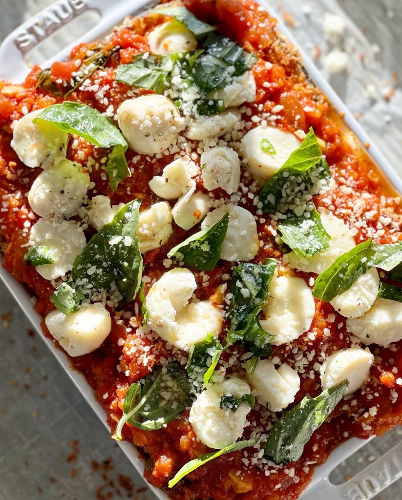 Reduce oven temp to 350. Ladle a few spoonfuls of sauce on the bottom of your baking dish. Overlap 4 rounds of prepared baked eggplant on the bottom. Cover generously with additional sauce and top with half of chopped mozzarella balls and additional torn basil. Repeat the process again and sprinkle with parmesan. The casserole dish should be nicely full. Bake for about 35-45 minutes until bubbly and cheese is melted. Remove from oven and allow to cool for a few minutes before cutting and garnish with additional fresh basil. Serve with pasta and extra sauce and extra parmesan as desired. Enjoy!