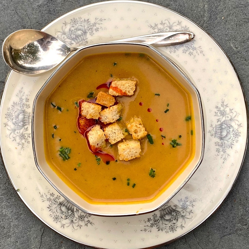 A vegan soup that will add great fall flavor to your table. Love the sweet and spicy flavor of this soup and it’s beautiful creamy flavor and fall colors. You can prepare a few days ahead of time and reheat and garnish when ready to serve.