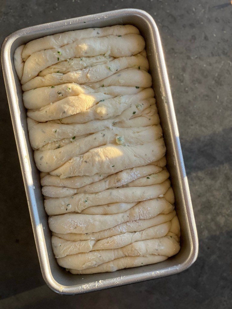 While the dough rises grease a 8 x 5 inch loaf pan with non stick cooking spray. Combine all ingredients for filling. Punch down the dough to release the air. Place it on a lightly floured work surface and divide into 12 equal pieces and roll into a ball slightly larger than a golf ball. Using lightly floured hands, flatten each into a circle that doesn’t have to be perfectly round. Spread about a few teaspoons of filling mixture in the middle of the circle each. Fold the disks in half and line the prepared baking pan, round side up, tucking each folded circle against the last (see photo above). Cover again with plastic wrap or aluminum foil and allow to rise once again in a slightly warm environment until puffy, about 45 minutes.