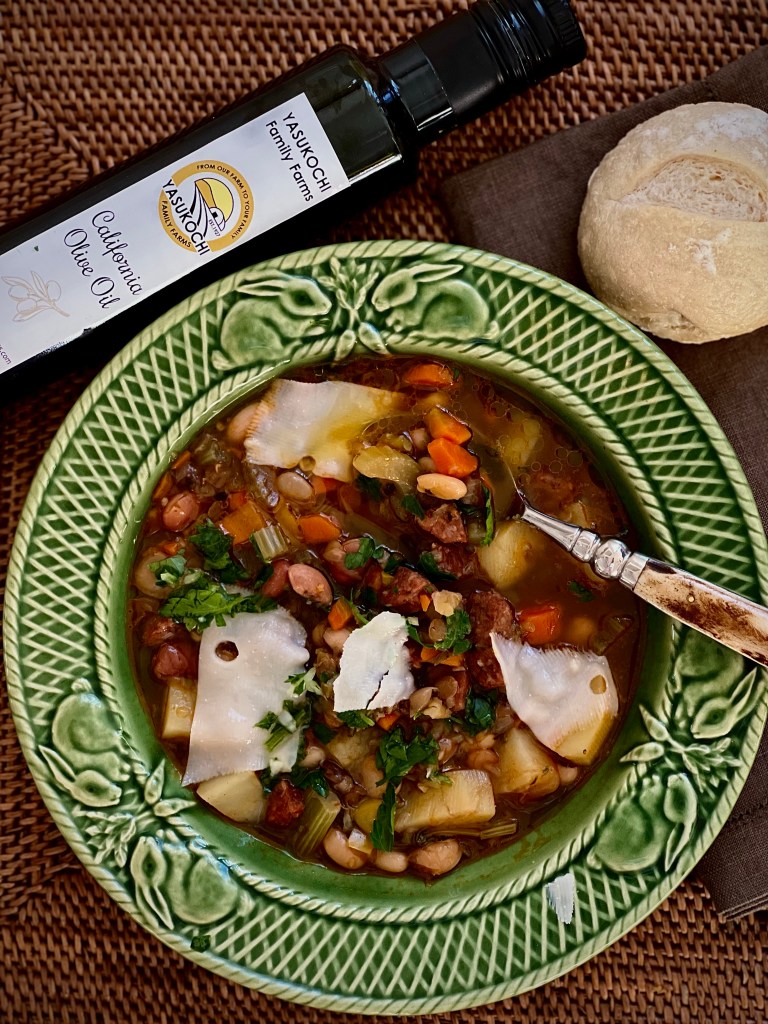 A hearty soup that has great flavor with the addition of sausage. I like to use a homemade stock if possible either vegetable or chicken is great. If you don’t have any on hand, use your favorite store bought version. I love to finish the soup with a drizzle of high quality olive oil. This local California grown oil from Yasukochi farm is just delicious. Serve with your favorite rolls for a delicious dinner.