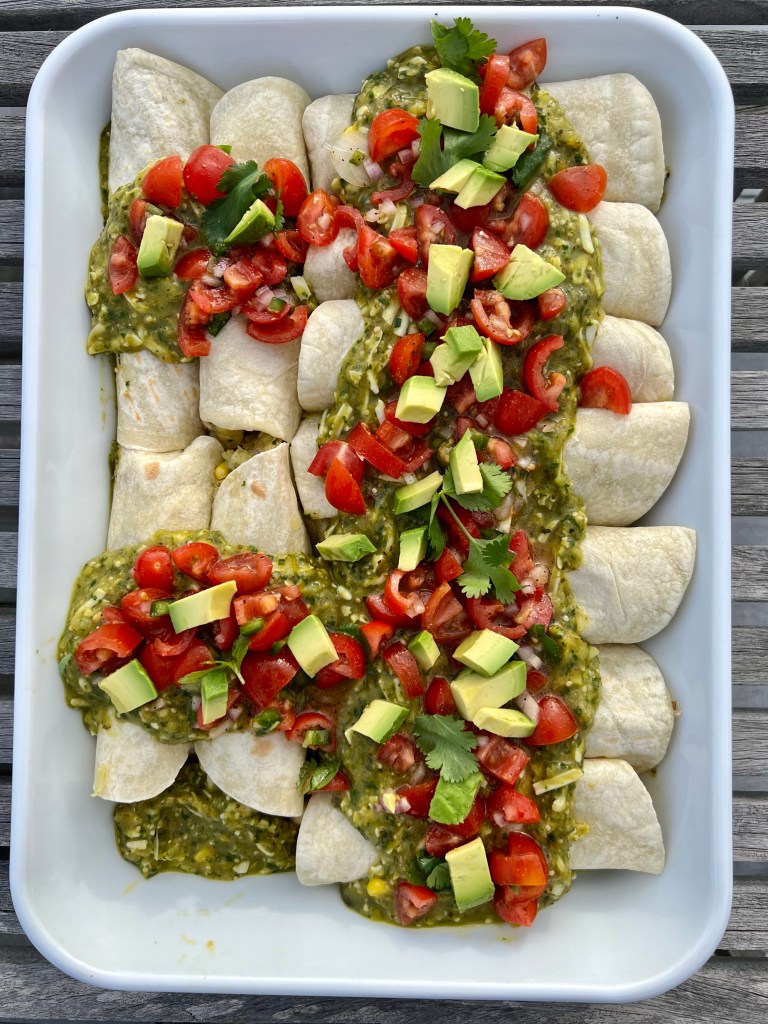I have many iterations of this enchilada recipe. Love the citrusy tomatillo sauce that tastes great with the enchiladas. Extra sauce is wonderful with eggs or as a sauce for meat or fish if you have leftover. It really helps to warm the tortillas before you roll them. I usually heat them in a nonstick pan for just a couple of minutes but not so long that they toast. if you don’t want to go to the trouble of making your own chicken, you could also buy a prepared rotisserie chicken and shred the chicken adding the seasonings. I prefer to bake my own, but it is an extra step and another dirty pan! Serve with beans, steamed rice and enjoy!