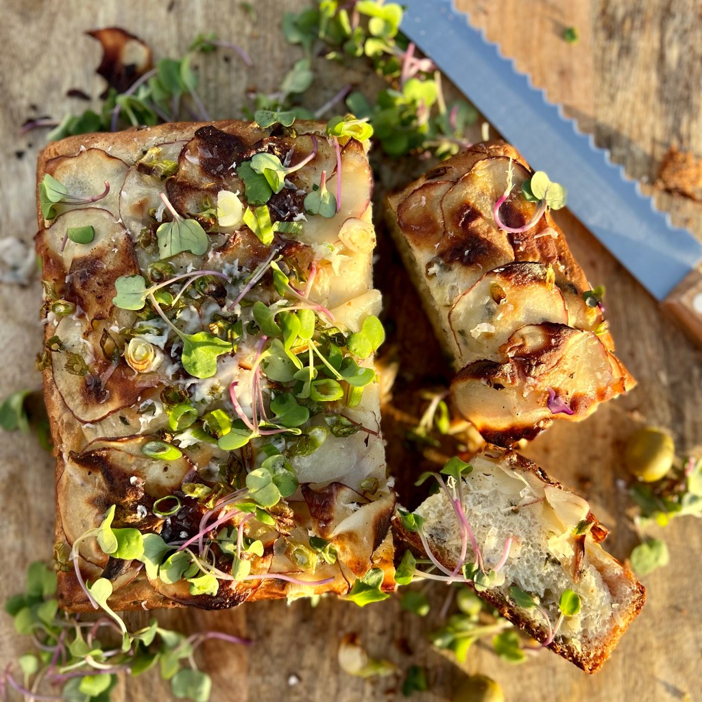 Preheat oven to 450. Uncover dough and dimple the dough with your fingertips, pressing down to the bottom of the pan every inch or so. It doesn’t have to be perfect. Cover loosely again and allow dough to rise for an additional 15 minutes ( ideally it should rise to about halfway up the pan) Slice potato (preferably with mandolin) about 1/16 of inch thick. Pat dry and toss with a bit of olive oil and salt and pepper. Place potatoes, slightly overlapping on top of the dough and take about half of scallions and distribute evenly on top of potatoes.
