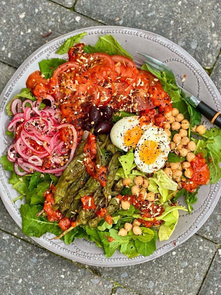 Assemble salad on platter or bowl. Place okra, tomatoes, chickpeas, pickled onions and egg on top of lettuce. Drizzle with dressing and sprinkle with desired seasoning. Enjoy!