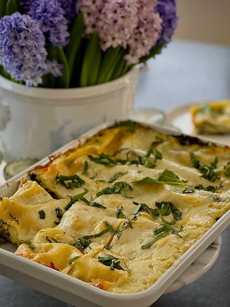 A creamy Béchamel makes this vegetarian dish wonderfully rich and satisfying. I like to use a combination of cheeses and some fresh basil for great flavor. I think a combination of fresh and frozen spinach works best and it’s helpful to have a good processor to shorten the prep time. Also, opt for no bake lasagna which works well for any lasagna dish.