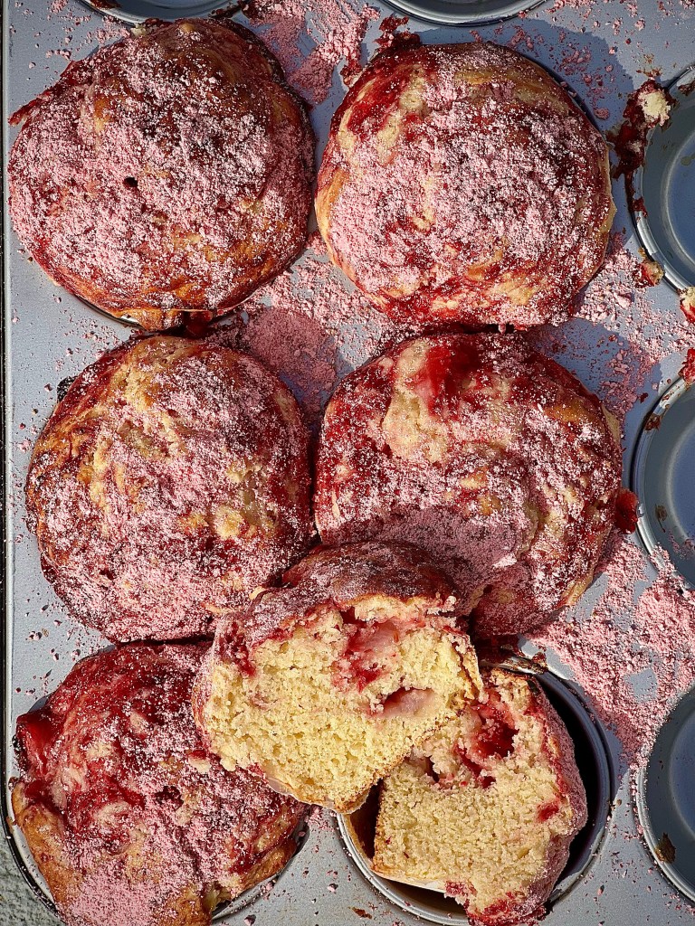 I can’t get enough of the beautiful Carlsbad strawberries that you can pick up fresh or pick yourself locally. They are so sweet and delicious. These muffins are sprinkled with a little strawberry sugar for extra flavor. I had the strawberry powdered sugar left over from my hand pies and they were a perfect sprinkle of love to top the muffins, especially on Mother’s Day! This recipe can make an even dozen, but I made my muffins a little extra large, so I had 11 muffins. You may have to adjust the baking time just a bit if you are a fan of a more bakery style muffin as I am. You could also substitute different berries in your muffins.
